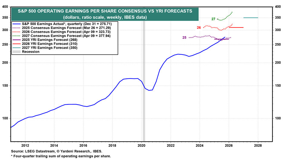 The US economy remains resilient, and so do corporate earnings. The US economy has passed several stress tests in recent years. The war in the Middle East is proving to be the latest stress test for the US economy, which seems to be passing it, so far. The macroeconomic data released in recent weeks confirms this resilience. The pre-war growth trajectory was solid enough that we were on the verge of raising our already bullish earnings estimates for 2026 and 2027. The war stopped us from doing that.