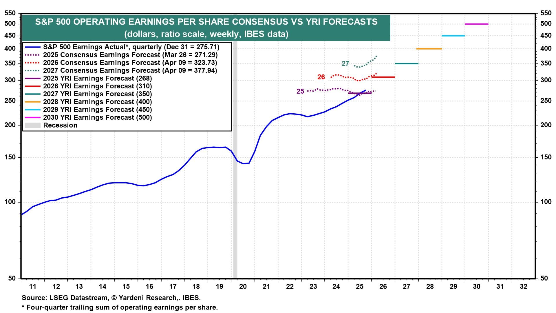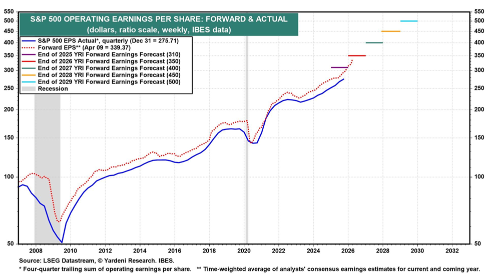 (4) Long-term EPS. We project S&P 500 EPS will rise to $500 in 2030 (chart). We continue to bet on the economy's resilience. So our revenues and earnings forecasts assume no recession this year or over the next five years.