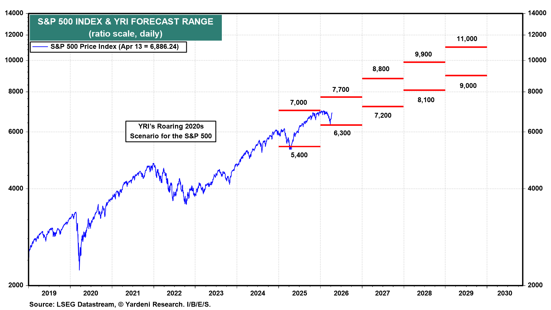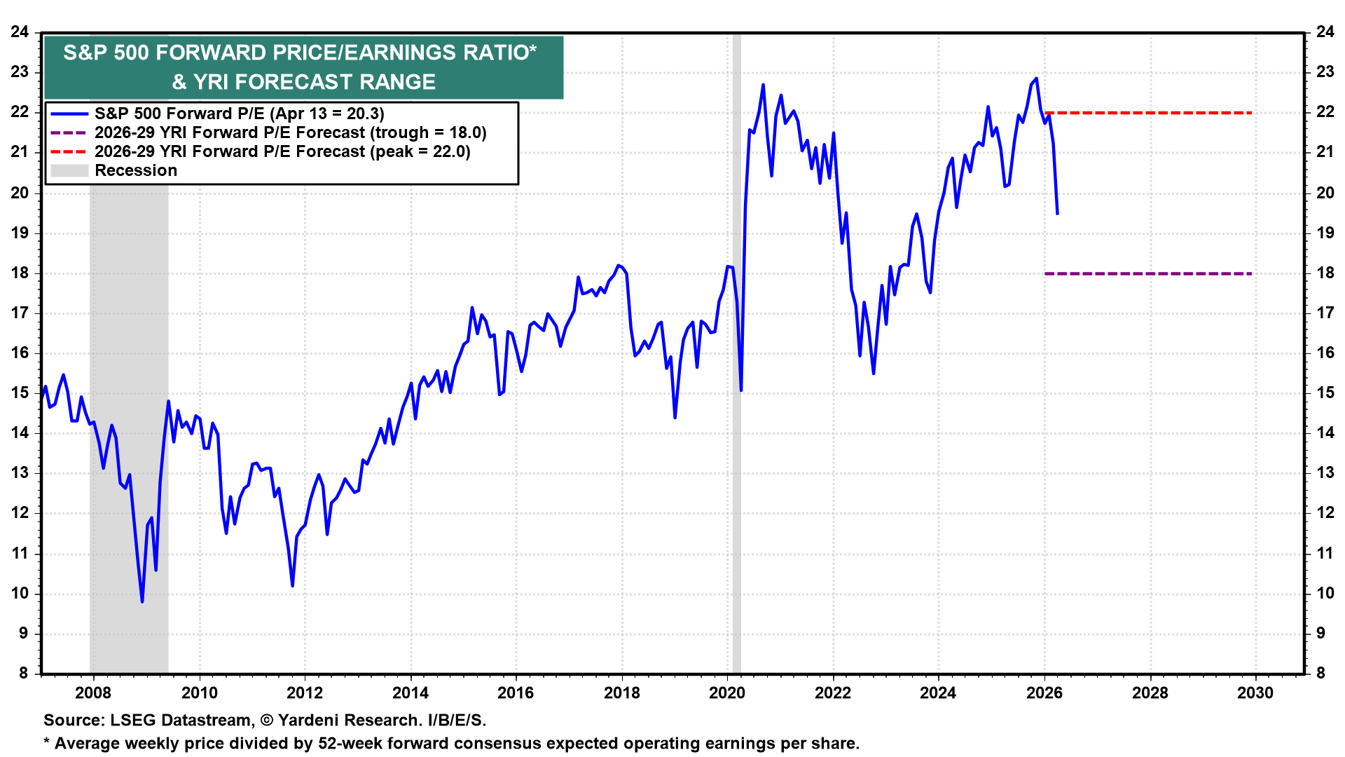 (6) Forward P/E. We are also assuming that the S&P 500 will trade in a forward P/E range of 18-22 over the rest of the decade (chart). That's mostly because we don't expect a recession over this period.